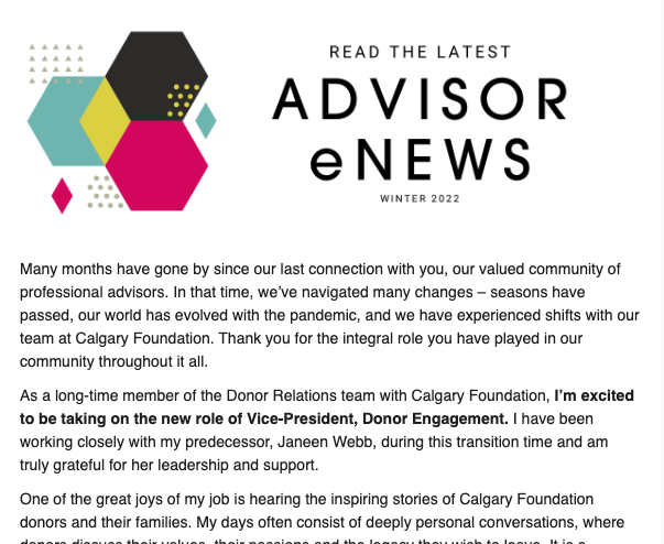 The Advice to Advisors newsletter provides timely information on philanthropy and charitable giving.